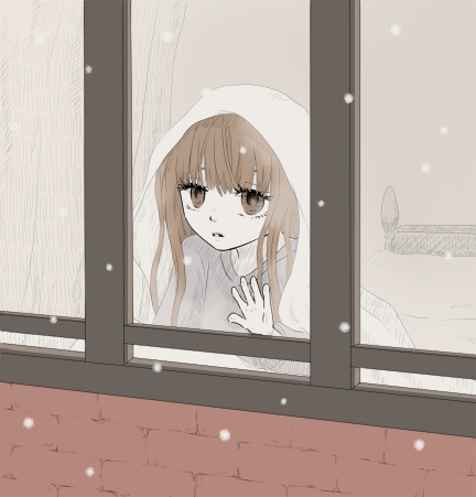 クリスマスというか冬の朝。シーツ被って雪を見るココ。